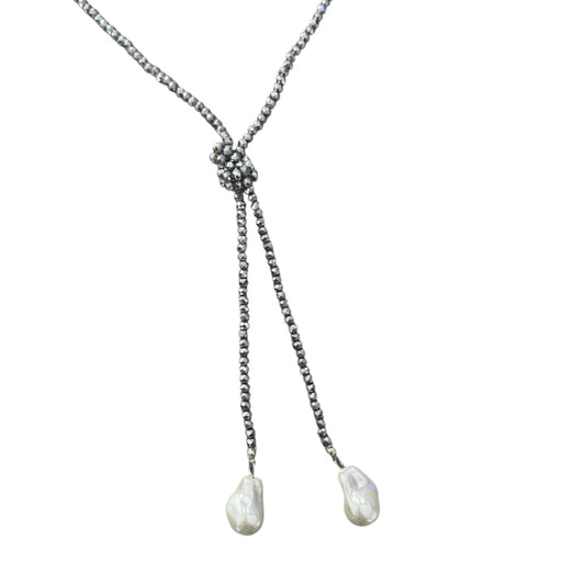 0002 (Long) Beaded Necklace with Faux Pearl Ends, Pewter