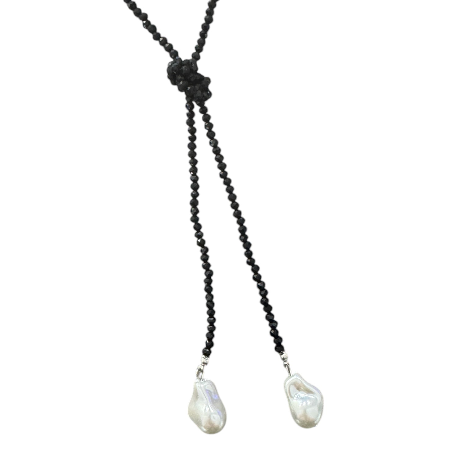 0002 (Long) Beaded Necklace with Faux Pearl Ends, Black
